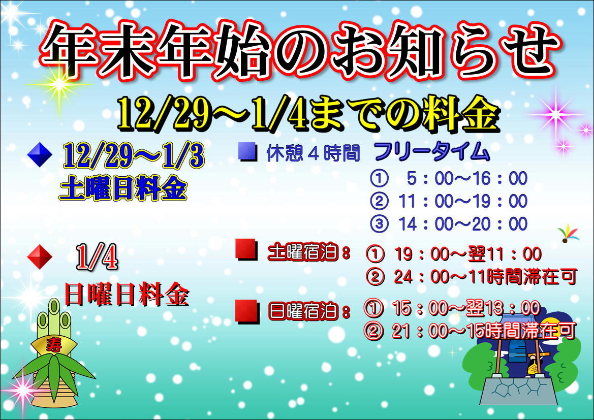 ホテルシカレからのお知らせ 年末年始料金のお知らせPosted on 投稿日: 2025年12月22日更新日: 2025年12月13日 12/29(月)~1/4(日)の期間、以下のとおり、特別営業となります。 ご利用の際は、お間違いのないよう、ご注意くださいませ。 記事一覧